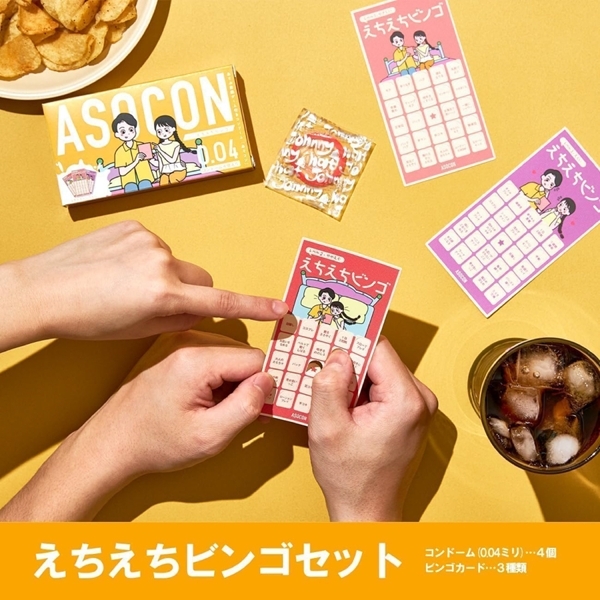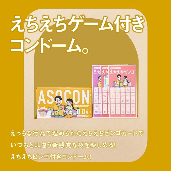 遊び心たっぷりの新感覚アイテムが登場♪あそぶ前戯ゲーム付きコンドーム「ASOCON」えちえちビンゴカードは、ビンゴ形式で楽しく盛り上がれるカード付きセットです!3種類のビンゴカードには、お題がそれぞれ異なるマスが並んでいます♪順番にお題をこなしながらビンゴを目指せば、自然と会話も弾みます!ルールはシンプルでカードのマスに書かれた内容にチャレンジし、縦・横・斜めでそろえばビンゴ成立です♪ゲーム性が高く、マンネリしがちな夜もわくわくする時間に早変わり!セットには、0.04mmのコンドームが4個付属しています♪天然ゴムラテックス製でゼリー加工済み!サイズや仕様にもこだわり、使いやすさも兼ね備えた設計です♪気軽に楽しめるコンパクトなパッケージなので、ちょっとしたプレゼントにもぴったりです!