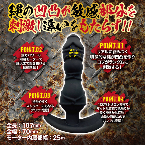 ペニスが緊縛されているような独特の形状の挿入シャフト、そして強弱を含んだ10種類のバイブレーションで穴の中を振動攻めしてくれる「メスイキ クレイジージャンキー (緊縛)」です。敏感な部分を強力な振動と独特な凸凹が刺激して悶絶必至♪4.5Vの強力パワー&10ファンクションシステム搭載&100%シリコンの強力イカセプラグ!抜き差しして楽しむも良し、挿れっぱなしでバイブ機能を堪能するも良しの優秀バイブです。