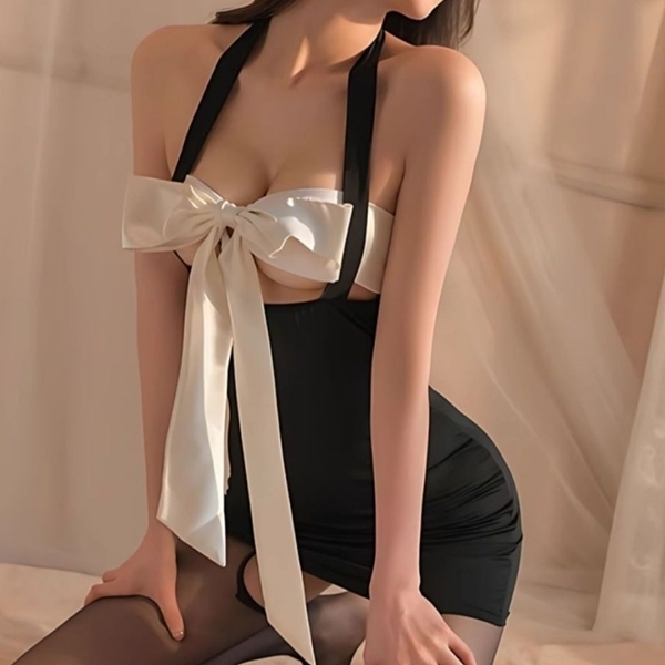 大胆でありながら可愛らしさも兼ね備えたボディコンワンピースセットです!セット内容はボディコンとTバックで、ストッキングは付属していません♪胸元に大きなリボンブラがあり、結び方次第で谷間の印象を自由に変えられます!ブラックの生地は着やせ効果とボディ引き締め効果が抜群で、ウエストからヒップにかけてのタイトなミニスカートが美しいラインを演出します♪背中は大胆に開いたホルターネック仕様で、後ろ姿も魅力的に見せます!動くたびに見えそうな限界ギリギリのミニスカートで、普段使いはもちろん特別なシーンにもおすすめです♪洗練されたデザインとスタイリッシュなフォルムで、魅惑的なコスプレ体験をお楽しみください!このセットで特別な時間を華やかに彩りましょう♪