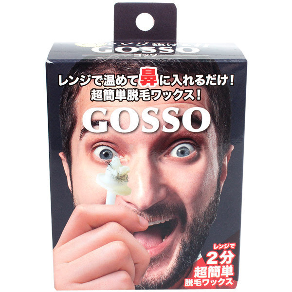 鼻毛処理に新革命!ゴッソリ抜ける最強の鼻用脱毛ワックス「GOSSO(ゴッソ)10回分キット」。●一気に抜ける超簡単な鼻毛脱毛セット●レンジで温めて鼻に入れるだけ●ブラジリアンワックス(50g)●専用スティック20本(両鼻10回分)●耐熱カップ1個・紙カップ5個●取扱い説明書付属。気になる鼻毛と一瞬でオサラバ!美容業界で大注目のブラジリアンワックス脱毛を取り入れた鼻毛処理グッズ。使い方は耐熱カップの中に水を入れ、その上から紙カップを入れてワックスをレンジで温め、スティック先端に溶かしたワックスを適量巻きつけたら鼻にイン!完全に固まったら引き抜くだけという簡単仕様。スティックの約1cm部分にはストッパーが付いているので必要な鼻深部の鼻毛はそのまま残せます。ポイントは躊躇せず一気に引き抜くこと!真下に勢いよく引き抜くことで痛みも最低限に抑えられます。残ったワックスはフタを閉めて保管可能です。