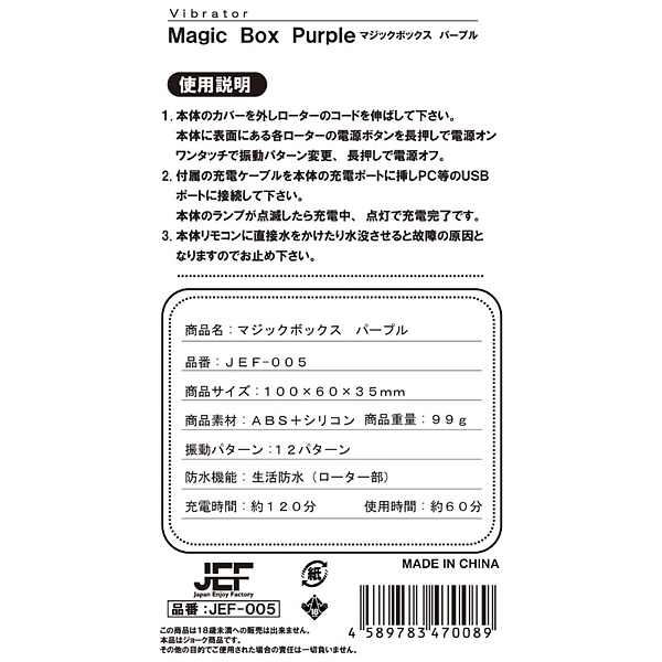 まるでコンパクトのようなオシャレな外観を持つ秘密の箱の中から、まるでマジックのように2種類のローターが現れる「マジックボックス」の登場。箱の蓋を開けると2種類のマジカルローターが格納されてます。小型の吸引タイプと通常タイプの2つもローターは可愛らしい見た目でも、毎分1万回転のワイルドな振動をもたらします。各ローターは最大12種類の振動パターンの変更ができます。独立した電源ボタンを採用しており、単体で振動させたり同時に振動させる事も可能。化粧BOXのような見た目なので鞄に入れたり部屋に置いても目立ちません。充電部分はタイプC型のUSBケーブルを採用。●カラー:パープル